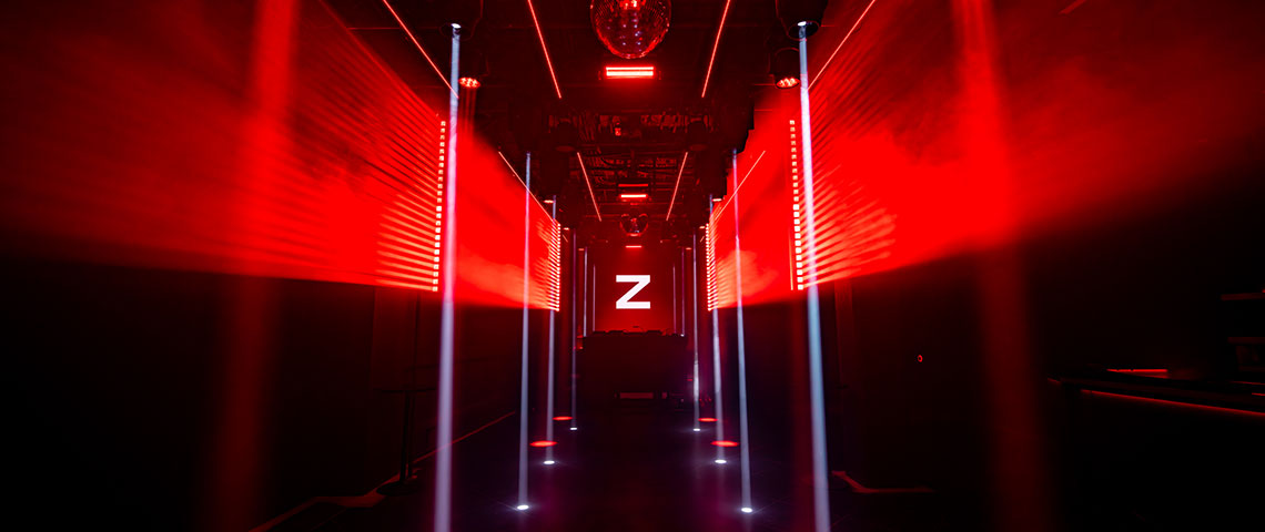 「Z MARUYAMA」は、本格的なサウンドシステムと照明、LEDによる映像演出を備えた、コンパクトかつ⾼機能なクラブ空間。過度な装飾を排したミニマルなデザインにより、⾳楽への没⼊感を最⼤限に⾼める。