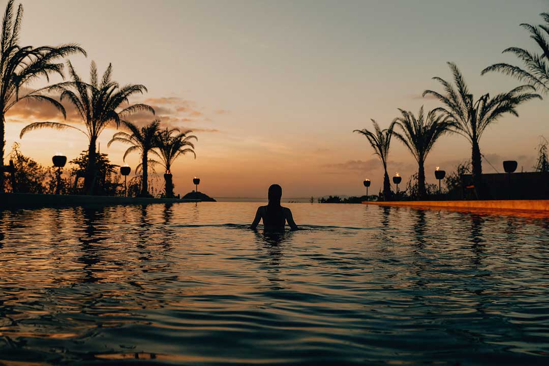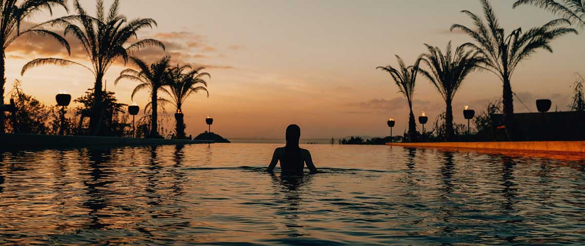施設を象徴する2つのプールは、外気に合わせた⽔温で初夏でも楽しめます。全⻑40メートルのインフィニティプールは、空と⽔⾯が溶け合うような、圧倒的な開放感を演出。また中央にはパームツリーをあしらったまるで南国のようなプールサイドでは、プールベットでくつろぎながらゆったりと⾳楽を楽しむことができる。
