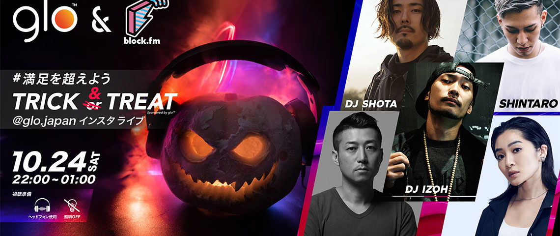 音楽プロジェクト『glo™ × block. fm Defy The Rules of Satisfaction』が、10月24日(土)の夜にオンラインでハロウィンDJパーティー「TRICK & TREAT」を開催することが決定。