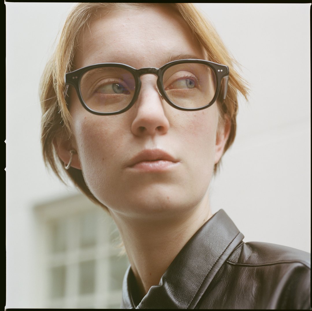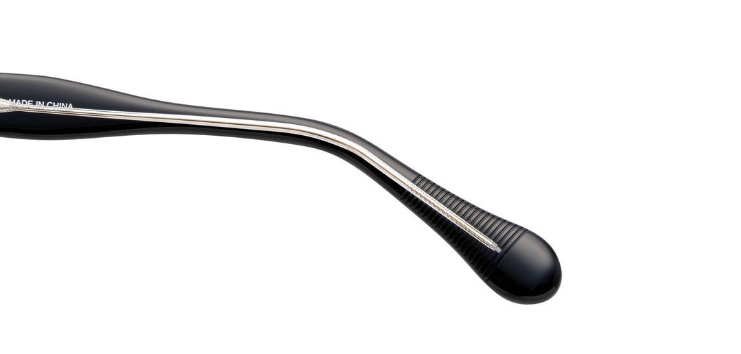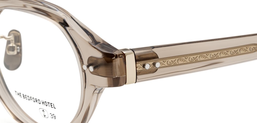 クリアなテンプルから細やかな彫金を施した金属芯が覗き、角度や光の当たり方によって表現が変化する、さりげない存在感を纏ったデザインになっている。テンプルエンドには空洞を設けた意匠を施し、金属の質感が際立つヴィンテージな雰囲気を演出している。