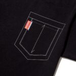 今回MINDSEEKERが手掛けるデザインは、1980年代に生産されたヘインズのTシャツにみられる「トロンプルイユ(騙し絵)」からインスパイアされた、本来存在しない胸ポケットを連想させるパターン画プリントに、鮮やかに目を引くピスネームが縫製されており、デイリーユースにも大人の遊びごころを取り入れた仕上がりとなっている。