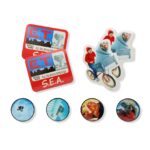 映画の印象的なシーンをモチーフに、ヴィンテージ風Tシャツ、BMXシーンフーディー、フレアデニム、缶バッジ付きキャップなどのアイテムを展開。また、ステッカーやキーホルダーなど、当時の映画グッズを彷彿とさせるアクセサリー類もラインアップ。