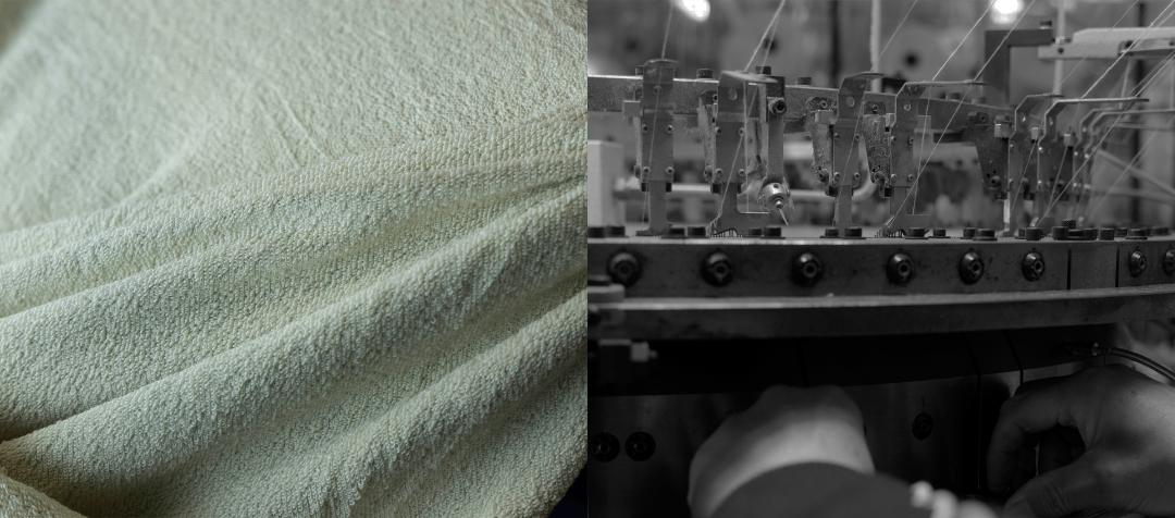 職人と技術者が試行錯誤を重ね、設計から完成まで約4年を費やして生み出した裏毛素材だ。世界に1台しか存在しない丸編機を使い、時間をかけてじっくりと編み立てているのがKOBE TERRYの最大の特徴だった。