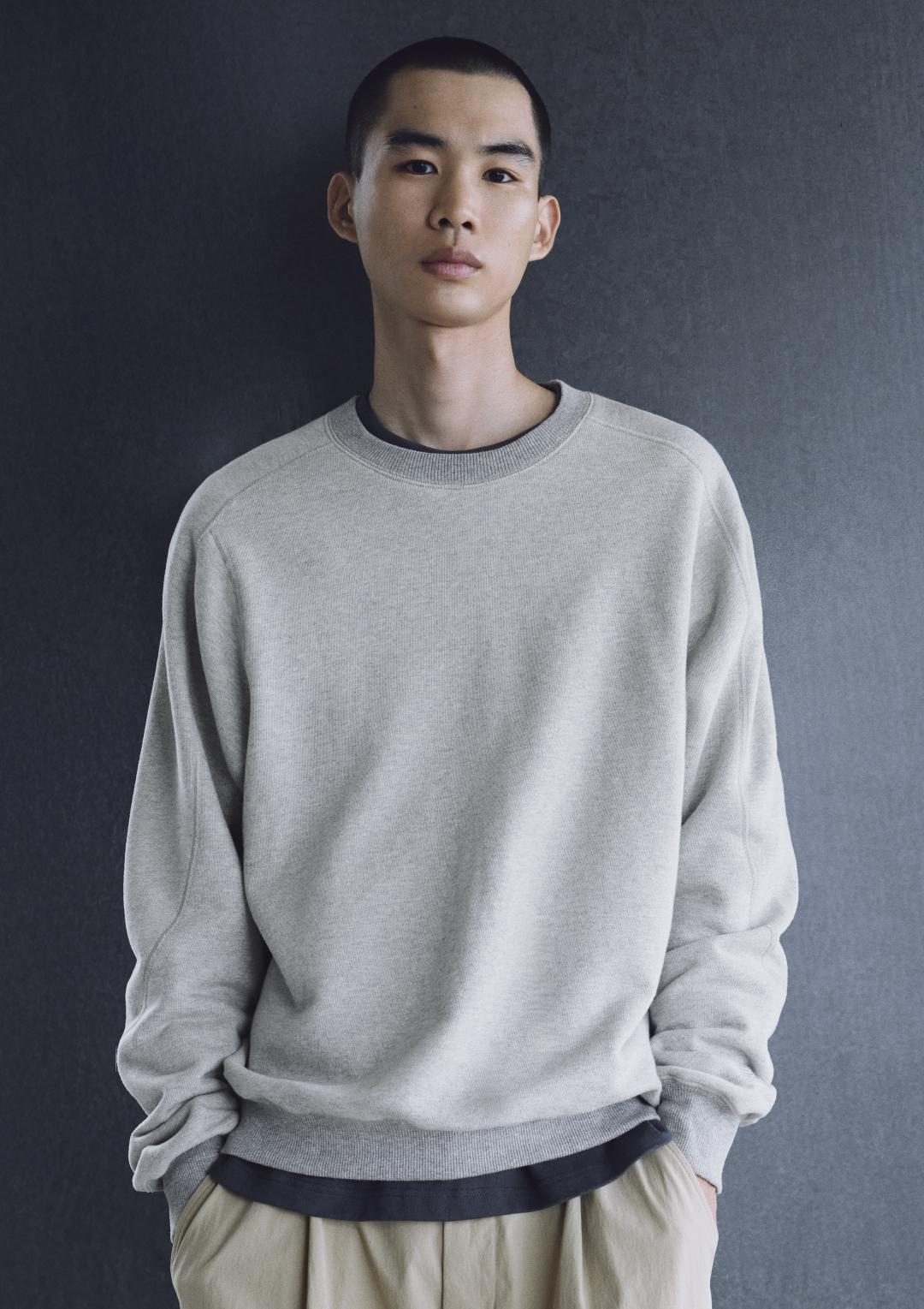 身頃にはあえてボリュームを持たせ、スウェットと身体の間にゆったりとした「間」をつくっている。この余白が、リラックス感と立体感のあるシルエットを生み、街で着たときの佇まいを一段引き上げていた。