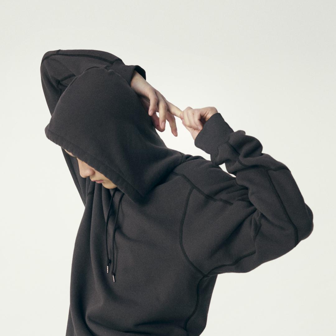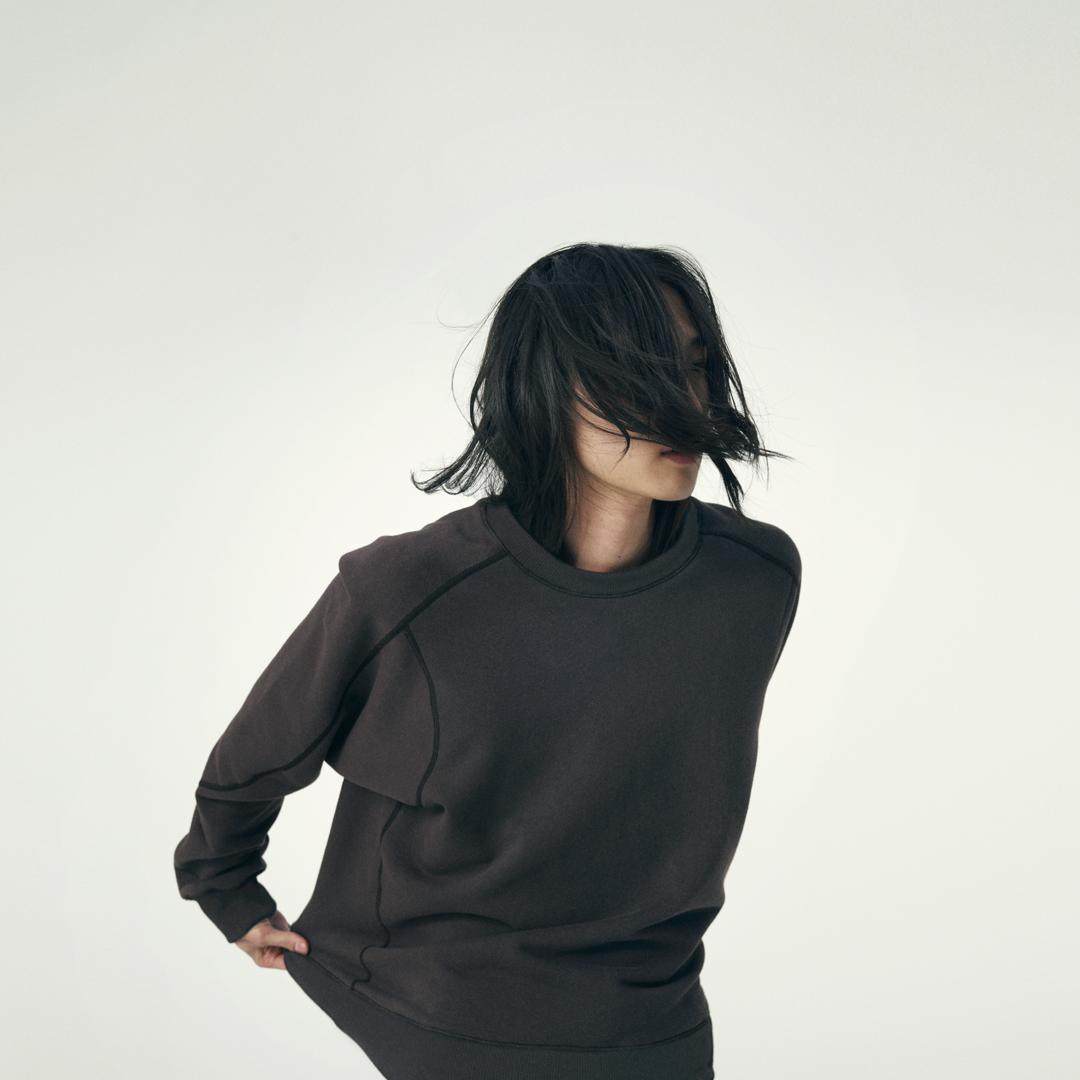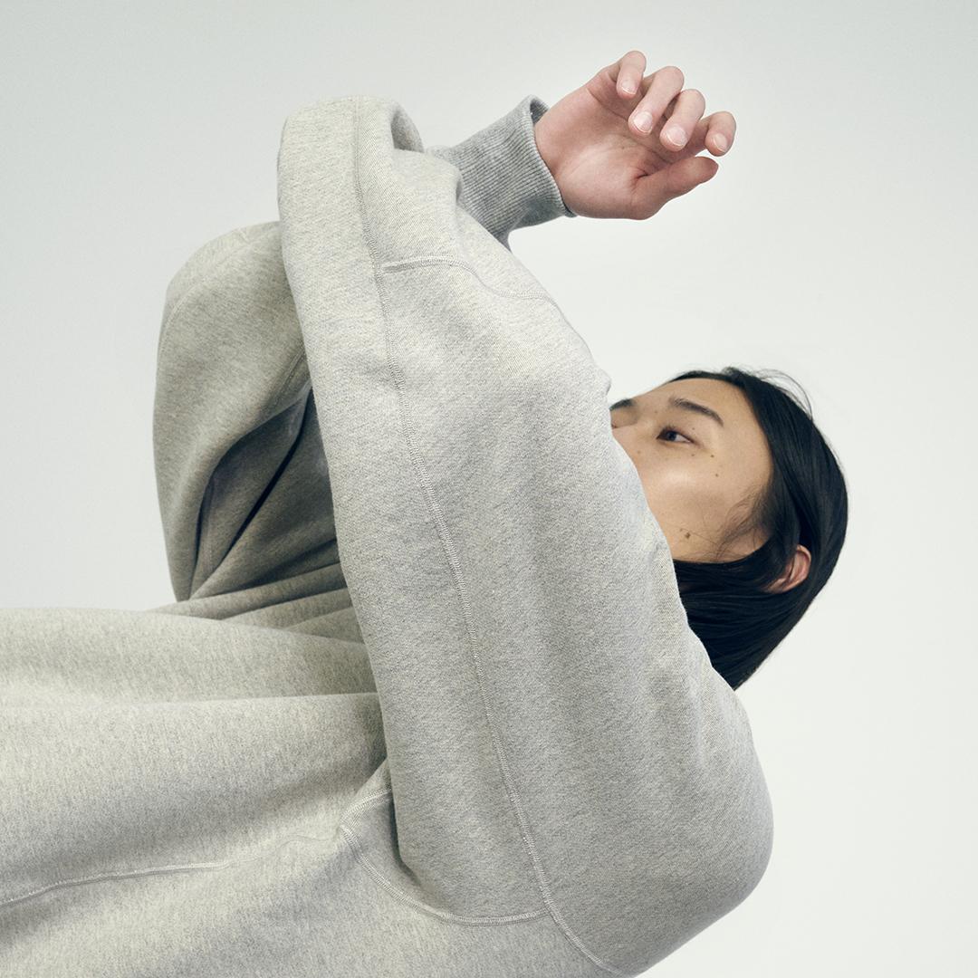 身頃にはあえてボリュームを持たせ、スウェットと身体の間にゆったりとした「間」をつくっている。この余白が、リラックス感と立体感のあるシルエットを生み、街で着たときの佇まいを一段引き上げていた。