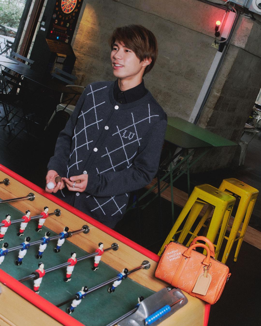 カーディガン¥369,600、シャツ¥233,200、パンツ¥195,800、バッグ「キーポル・バンドリエール 25」 ¥404,800、リング「ル ダミエ ドゥ ルイ・ヴィトン」(ホワイトゴールド×ダイヤモンド) ¥1,595,000