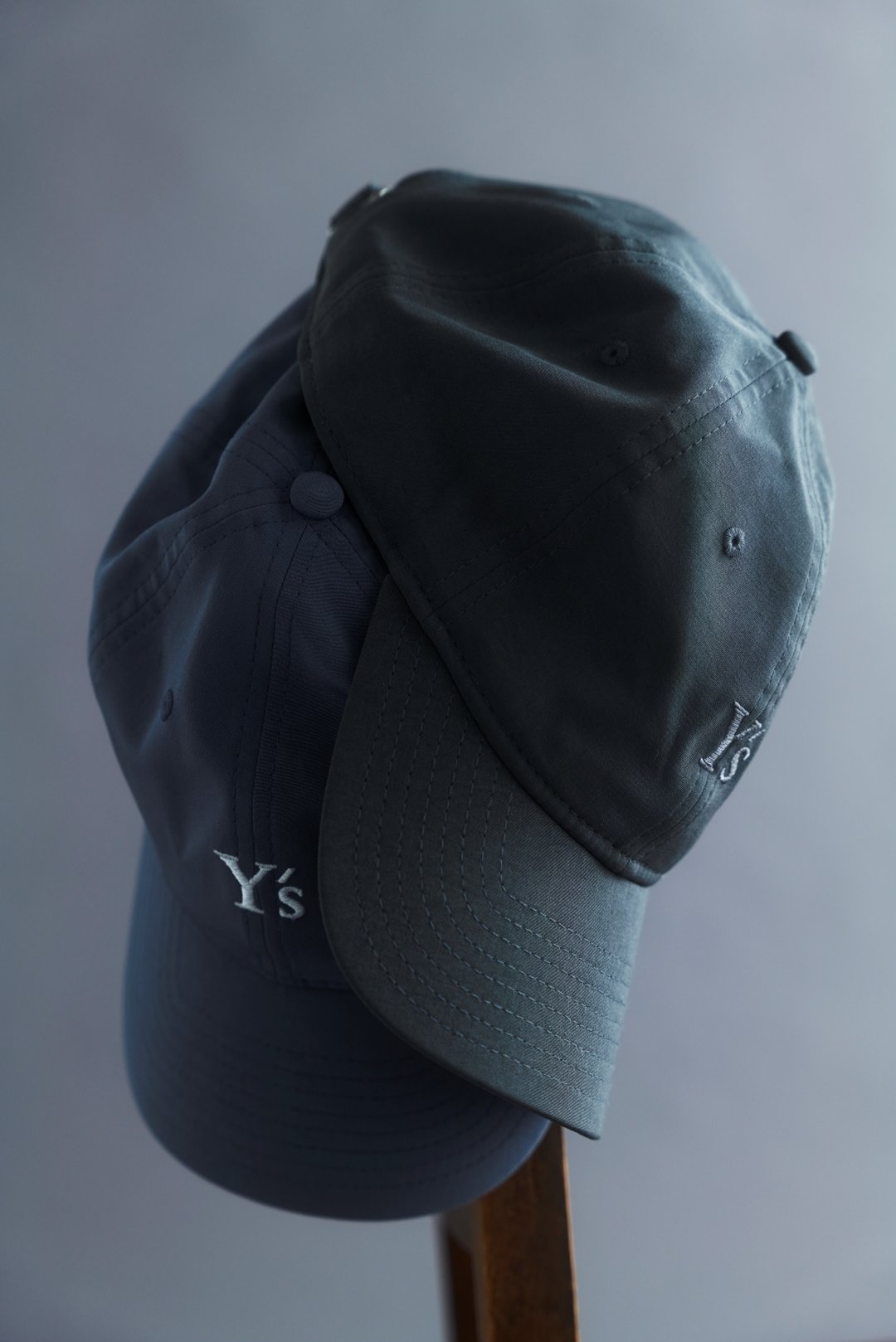 Y’sロゴキャップは2色展開。ライトグレーにはホワイトのロゴステッチを施し、グレーには同色のロゴステッチを施した。両モデルはヨウジヤマモト社を象徴するデシン素材で仕立てており、上品な光沢とさらりとしたタッチを持っている。さらに、空気を含むような軽さと扱いやすさを備えている。
