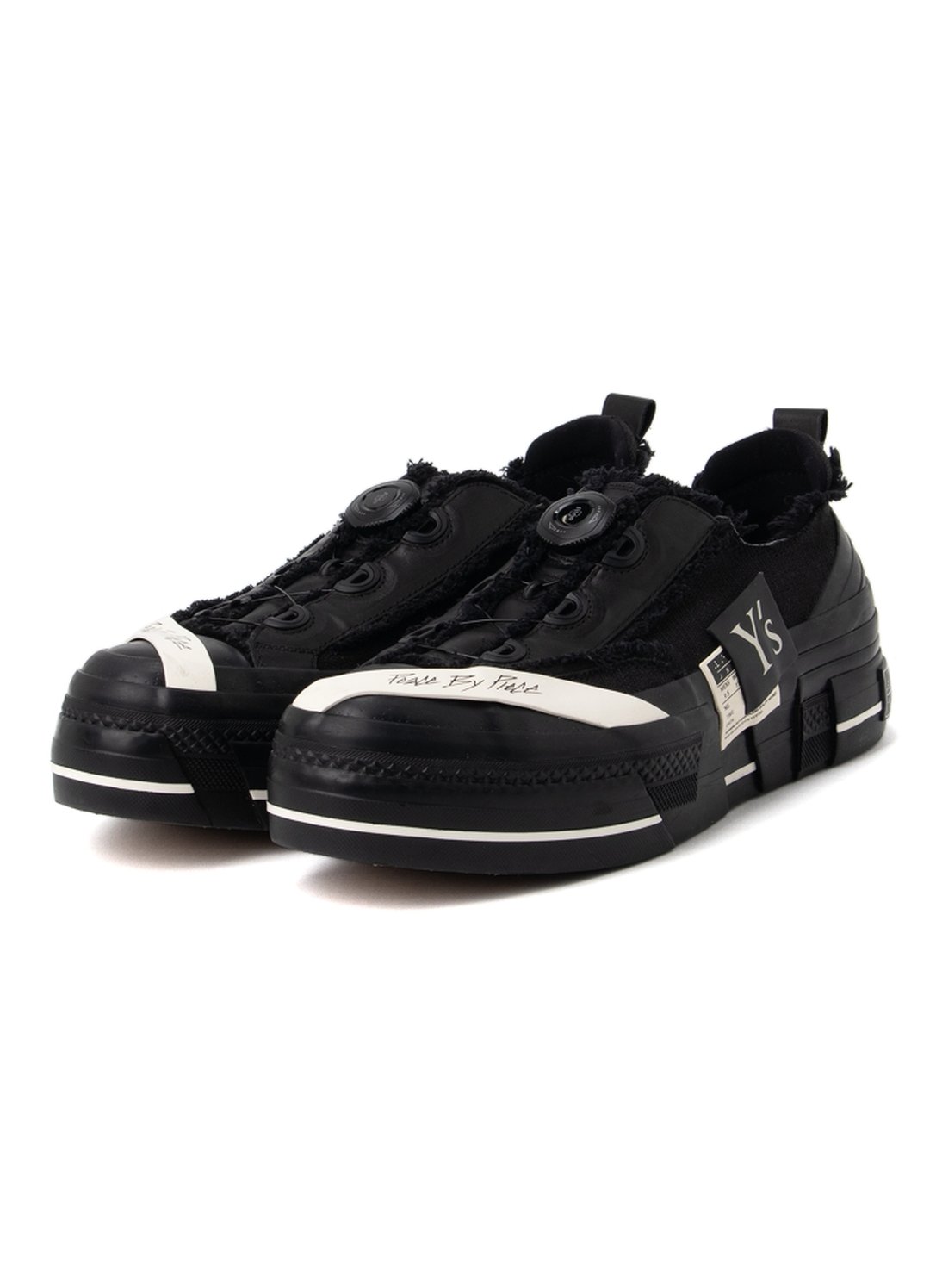 厚底スニーカーは、xVESSELのアイコニックモデル「G.O.P LOWS」を基にY’s独自に再構成されたデザイン。無数に分解されたソールパーツを再構築したようなレイヤードソールと、断ち切りのキャンバスデザインが目を引く。さらに、シューレースの代わりにFitgoレースアップシステムが採用されており、機能性とテクニカルな要素が融合している。