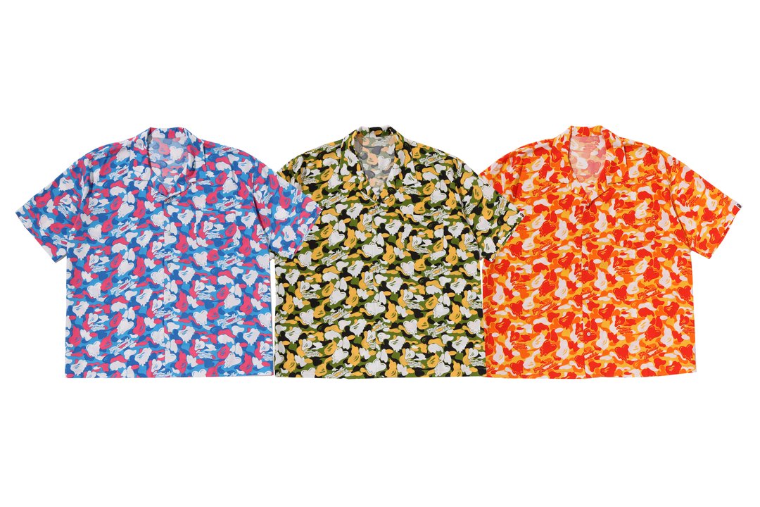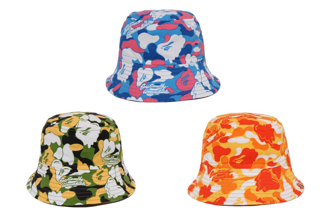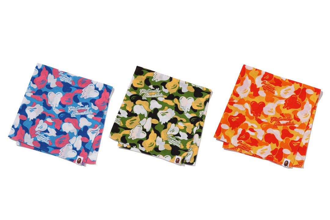 本コレクションは、ビーチを想起させるトロピカルなムードをベースに、アロハの開放感とストリートのエッセンスを融合させた。BAPE®のシグネチャーであるBAPE® CAMOに、EMOTIONALLY UNAVAILABLEのロゴとハートモチーフを組み合わせ、滴る雫のようなグラフィックで再構築したオリジナルカモ柄が特徴となっている。さらに、APE FACEを落とし込むことで、両ブランドのアイデンティティを象徴するビジュアルに仕上げている。カラーはオレンジ、グリーン、ブルーを基調とした鮮やかなトロピカルパレットで展開され、シーズンムードを強く打ち出すコレクションとなっている。