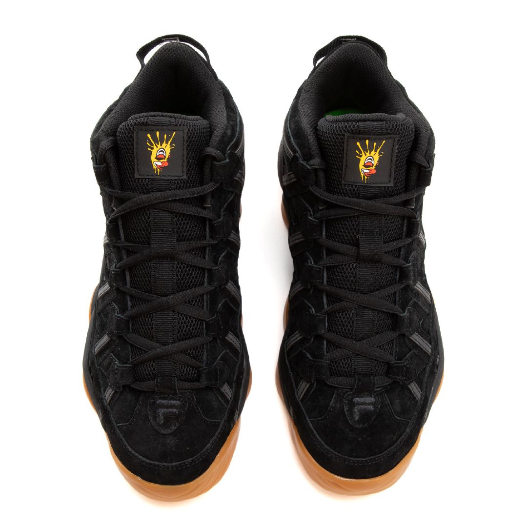 BUG!?お馴染みのトレードマークであるクラウンをモチーフとしたロゴと、FILAの代表的な90ʼsバスケットボールスニーカーで使⽤されていたオリジナルロゴを組み合わせアップデートした特別なロゴデザインは必⾒。