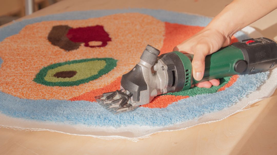 タフティングとは、ヘッシャンと呼ばれる専用の布に数本の糸を束ねた房を縫い込みラグマットを製作する技法。数年前より海外のアーティストがこの技法を活用して、オリジナルデザインのラグを制作する模様