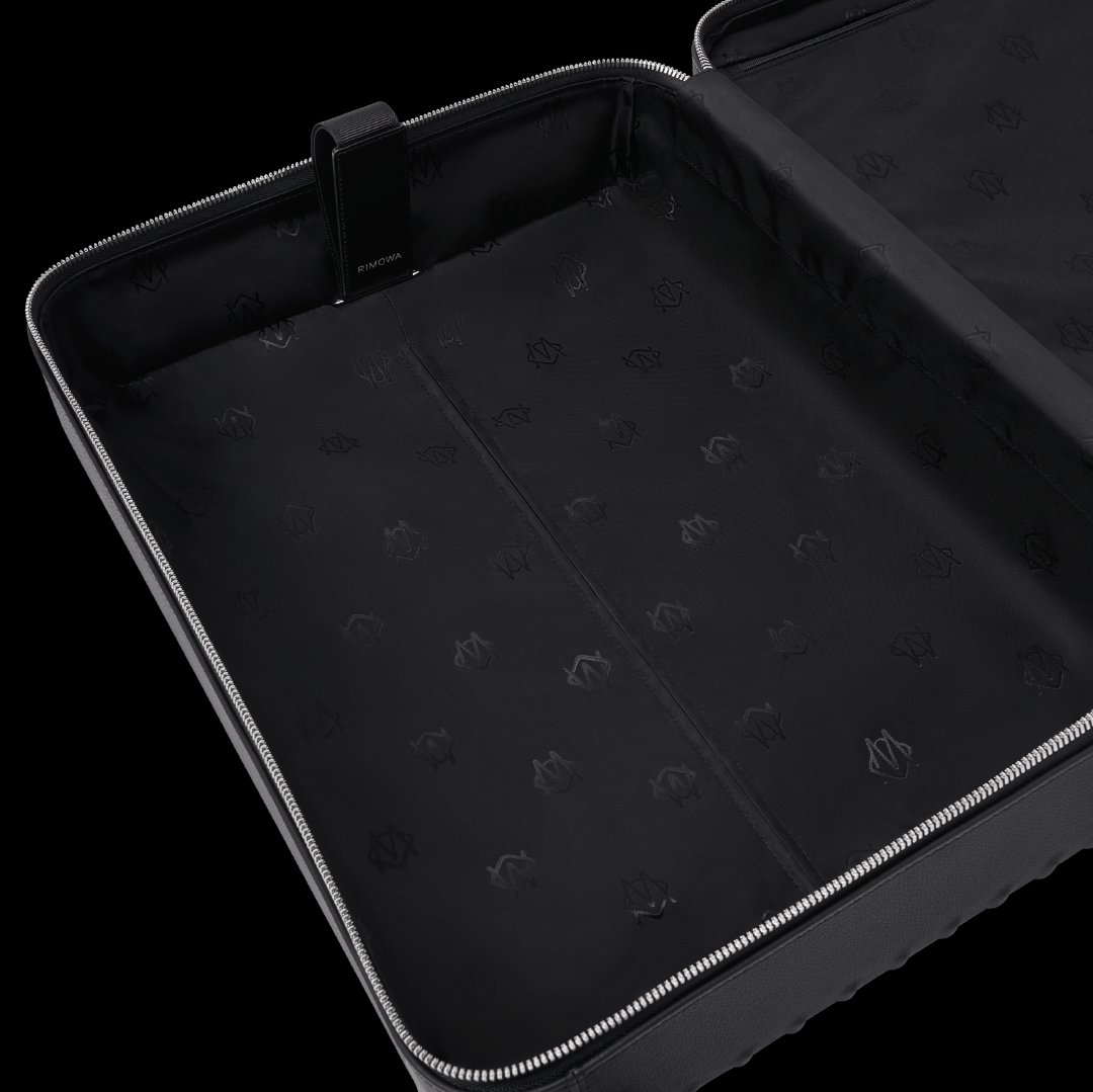ライニングはブラックカラーで統一されている。RIMOWAのモノグラムがジャカードであしらわれたライニング部は、片側にはRIMOWAのジッパー付きのコンパートメントとマチ付きのフラップポケット、もう片側には調整可能なデバイダーが備わる。また、お好みの高さに調整可能なテレスコープハンドル、RIMOWAマルチホイールシステム®といったRIMOWAの他のスーツケースと同様の洗練された機能性も備えている。また、トップハンドル部分はレザーで仕上げられている他、スーツケースの色味に合わせたレザー製のラゲッジタグも付属。