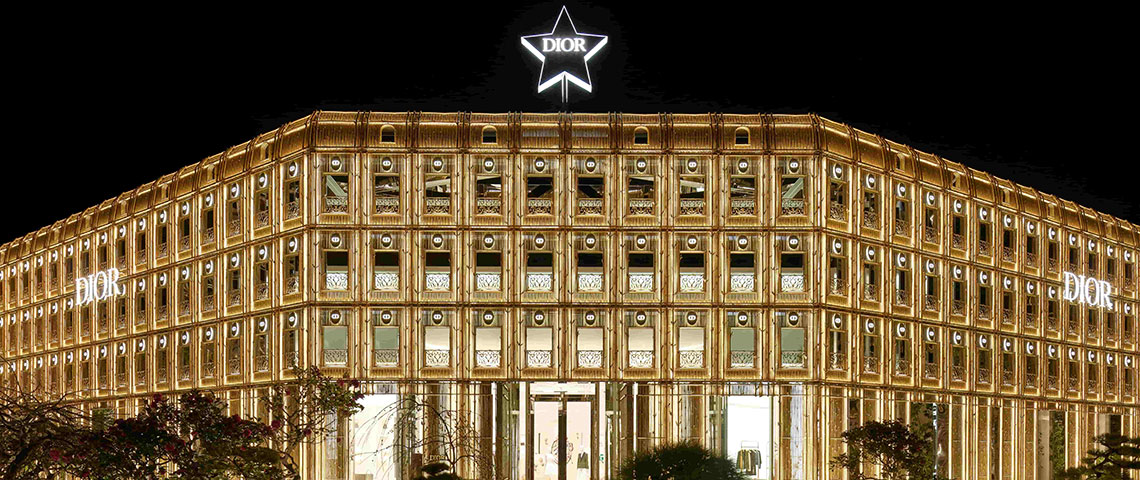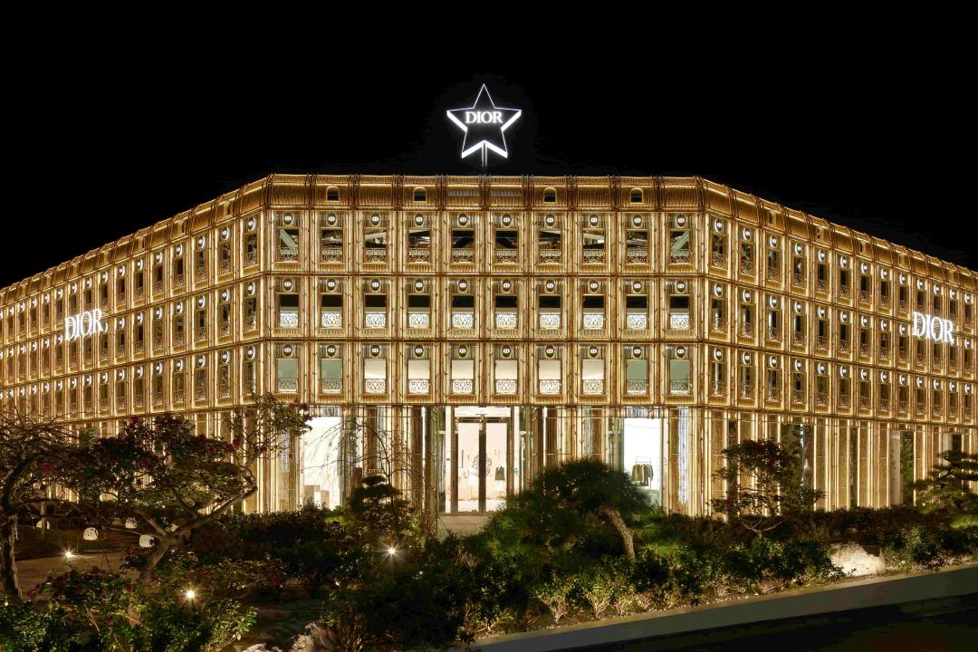 ディオールは、日本との揺るぎない絆を継承し、東京に「ディオール バンブー パビリオン」をオープンいたしました。パリの本店「30モンテーニュ」のファサードを想起させる壮麗な建築は、大胆なゴールドに染め上げた、日本の竹林が着想源のバンブーに再構築され、夜にはライトアップされる。