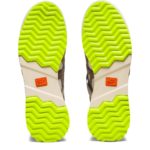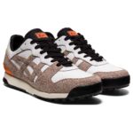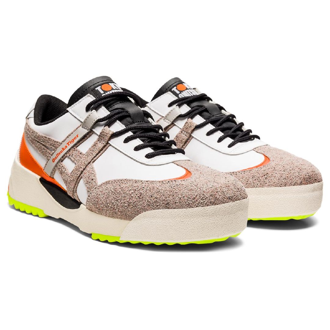 オニツカタイガーストライプをはじめ、各パーツに採用したリサイクル材からのぞく黒とオレンジの斑点は、レザー工場で実際にでた廃材そのものの色。スポーティな印象のシューズに味わい深い表情を添えている。