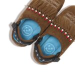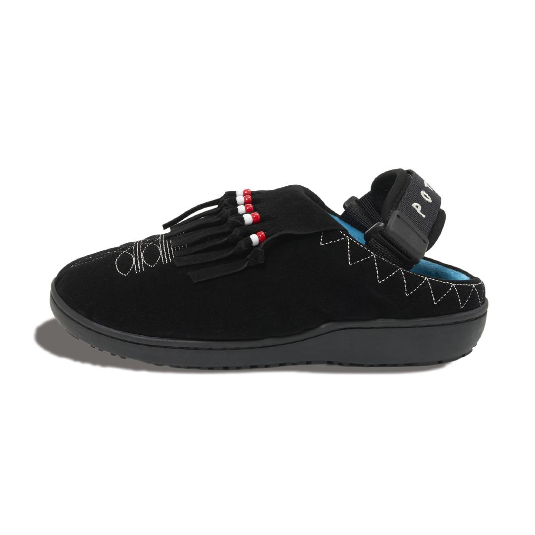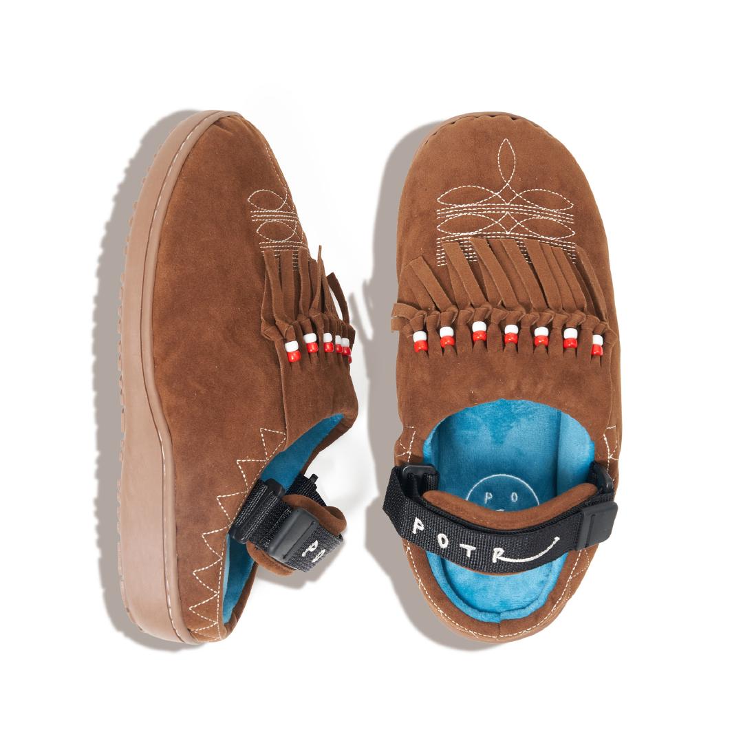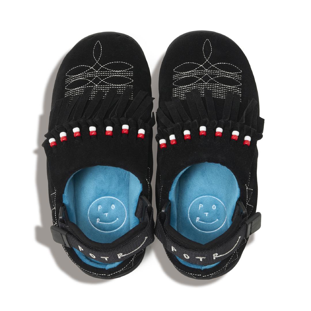 ネイティブアメリカンならではのフリンジや刺繍、ビーズを施し、フットベッドにはPOTRを象徴するターコイズブルーを採用した。