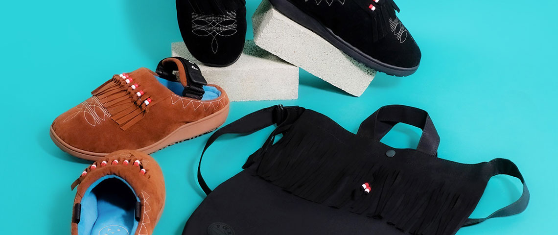 当時のネイティブアメリカンたちが、現代の技術によって最高の履き心地とクッション性を実現したSUBUを履いたらどう思うのか?と想像しながら製作した遊び心溢れるアイテム。