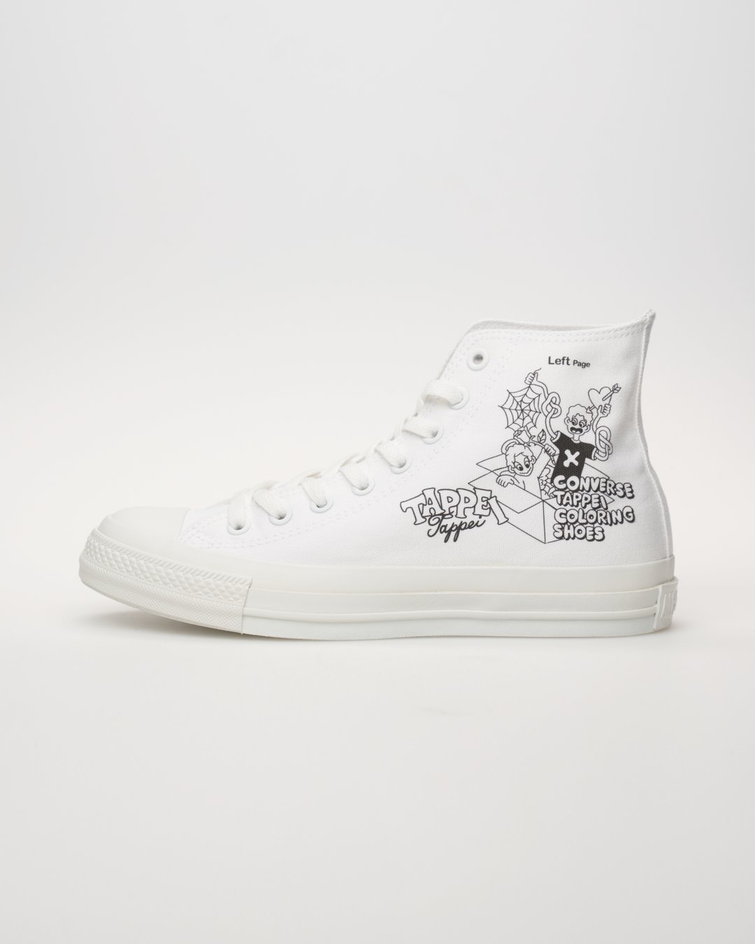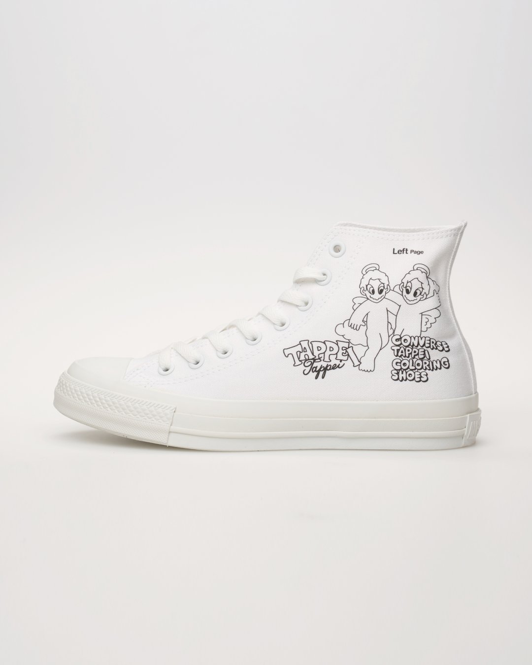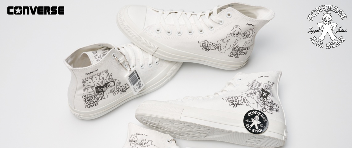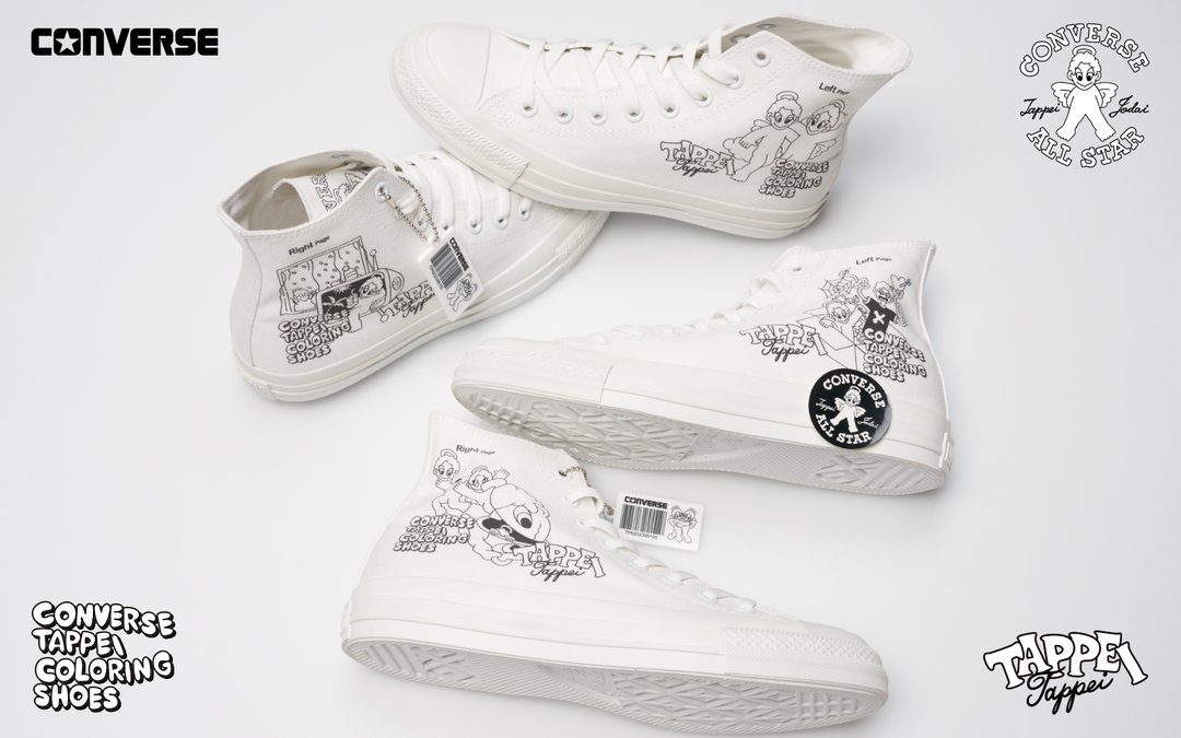 今回のプリントデザインは、TAPPEI氏がこの企画のために特別に描き下ろしたオリジナル作品であり、TAPPEI氏の代表的なモチーフである「天使のキャラクター」と「塗り絵」のインスピレーションを融合させて制作されている。また、デザインには「塗り絵」を思わせる「CONVERSE TAPPEI COLORING SHOES」「Right Page」「Left Page」といった遊び心あふれるキーワードが用いられている。