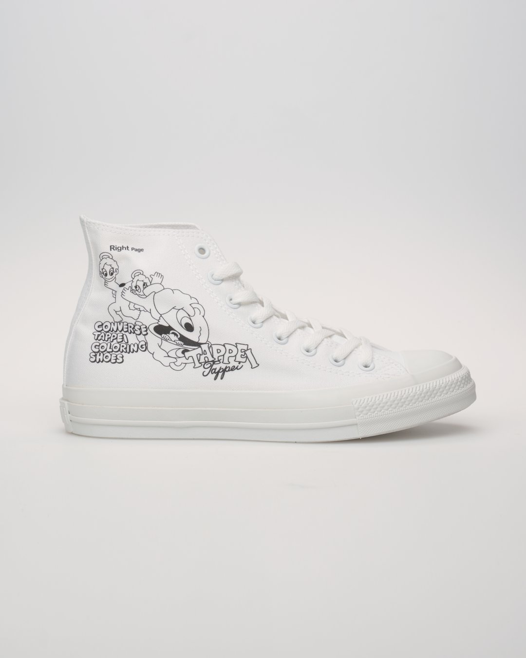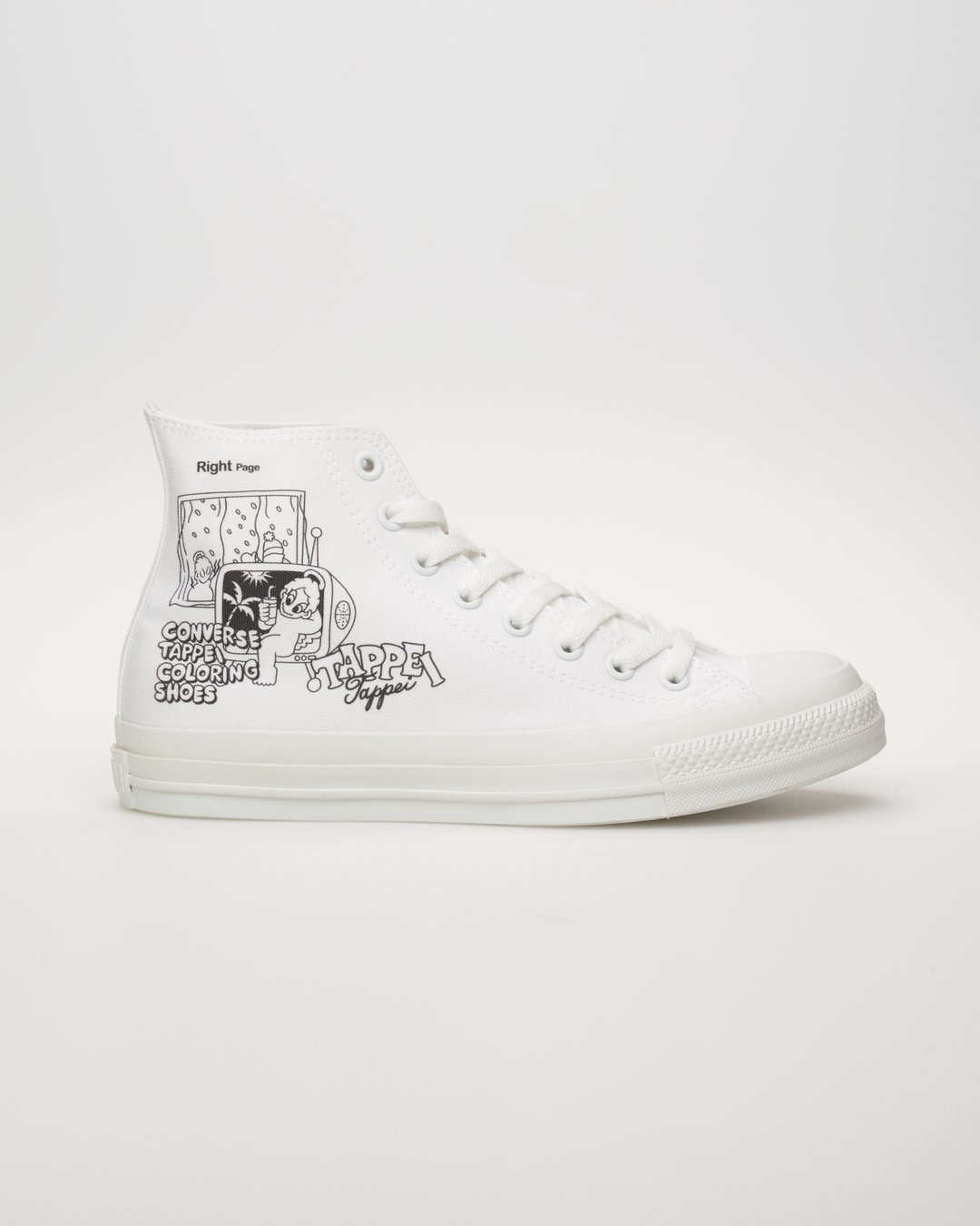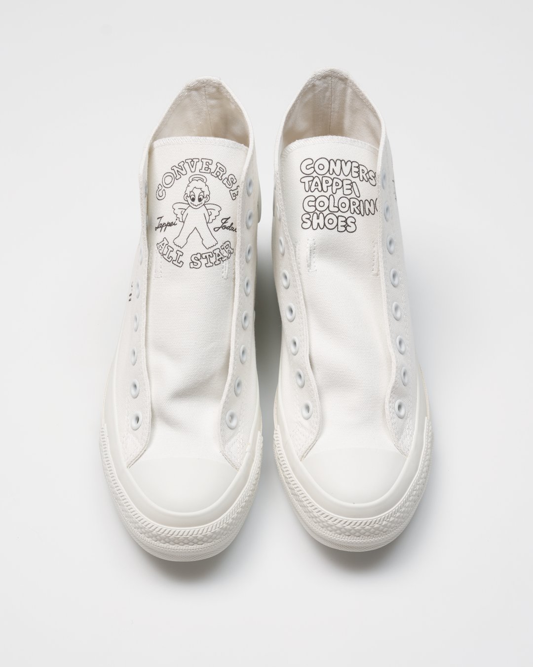 今回のプリントデザインは、TAPPEI氏がこの企画のために特別に描き下ろしたオリジナル作品であり、TAPPEI氏の代表的なモチーフである「天使のキャラクター」と「塗り絵」のインスピレーションを融合させて制作されている。また、デザインには「塗り絵」を思わせる「CONVERSE TAPPEI COLORING SHOES」「Right Page」「Left Page」といった遊び心あふれるキーワードが用いられている。
