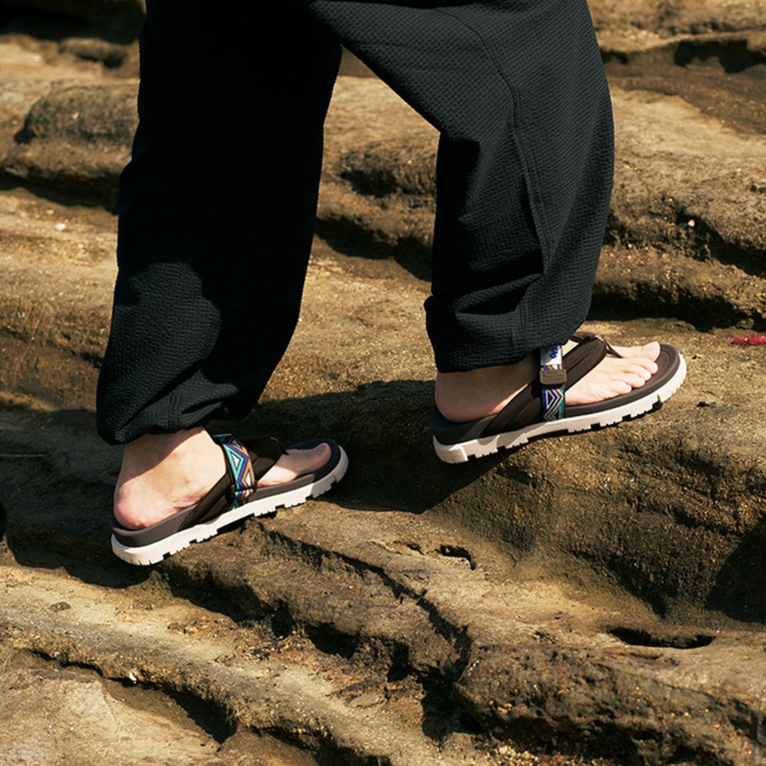 今回は、これまでのコラボとは異なる鼻緒タイプのサンダルで、軽量性とクッション性を両立させたSHAKAの人気モデル「CAMP BAY PARA BF(キャンプベイパラBF)」をベースに、リゾートシーンでゆったりと過ごすのに最適なコラボサンダルを制作した。