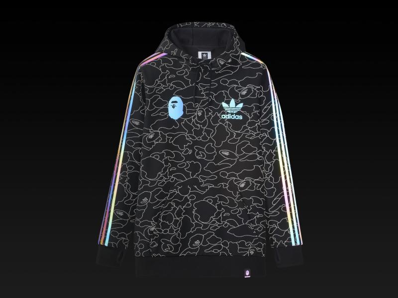 吸汗性、透湿性、速乾性のあるClimalite®素材に、耐久性が高い撥水加工を施した「BAPE® TECH HOODIE」、5K/5Kの通気性の高いシェル素材の「BAPE® SLOPETROTTER PANT」、10Kのウォータープルーフ素材を採用し、優れた機能性を持つ「BAPE® SNOW JACKET」の、3点のアパレルが登場。