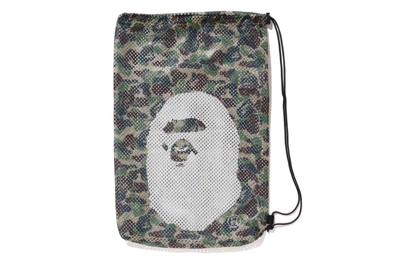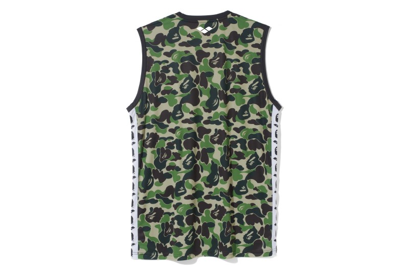 100分の1秒の世界で凌ぎを削るトップスイマーの戦いが繰り広げられ、普段陸上で生活する私たちに多くの驚嘆と感動を与える。水面を飛び交う水しぶきの中、鍛え上げられた肉体に纏えるギアは限られるため、選手たちを支える世界最速の水着作り、競泳水着メーカーの存在は欠かすことができない。1973 年にフランスで誕生以来、革新的でスタイリッシュ、さらに機能性に優れ、スポーツにインスピレーションを受けた製品を世に送り出してきたのが ARENA だ。水泳競技には特殊なルールがあり、国際水泳連盟・FINAの規約で、選手が着用する水着は市販される商品と全く同じものでないといけない。A BATHING APE®の代表的な「ABC カモ」パターンを中心に、アリーナの定番であるチームラインをBAPE®流にスペシャルデザイン。