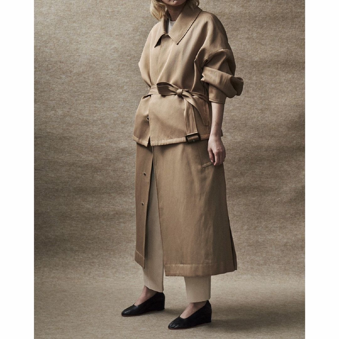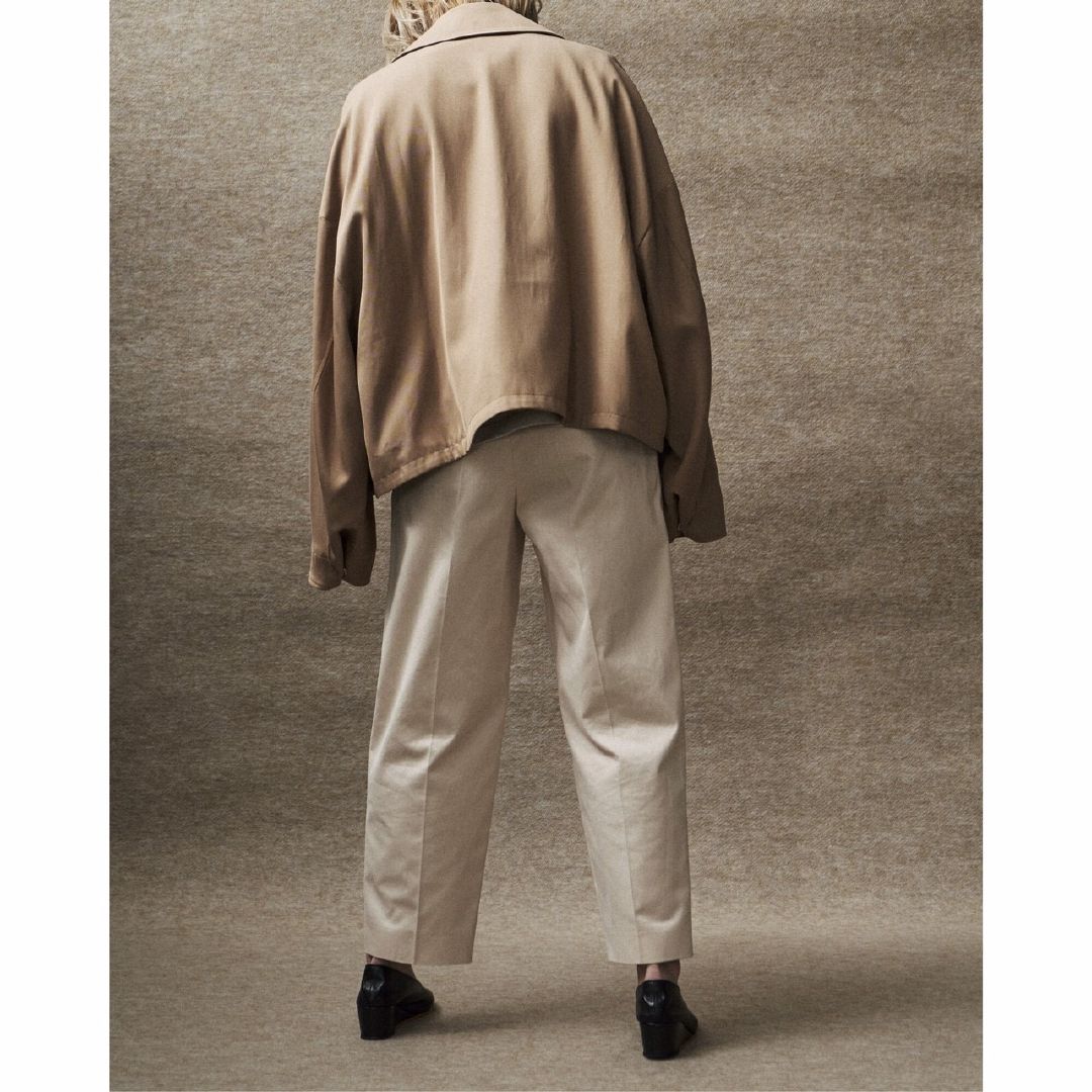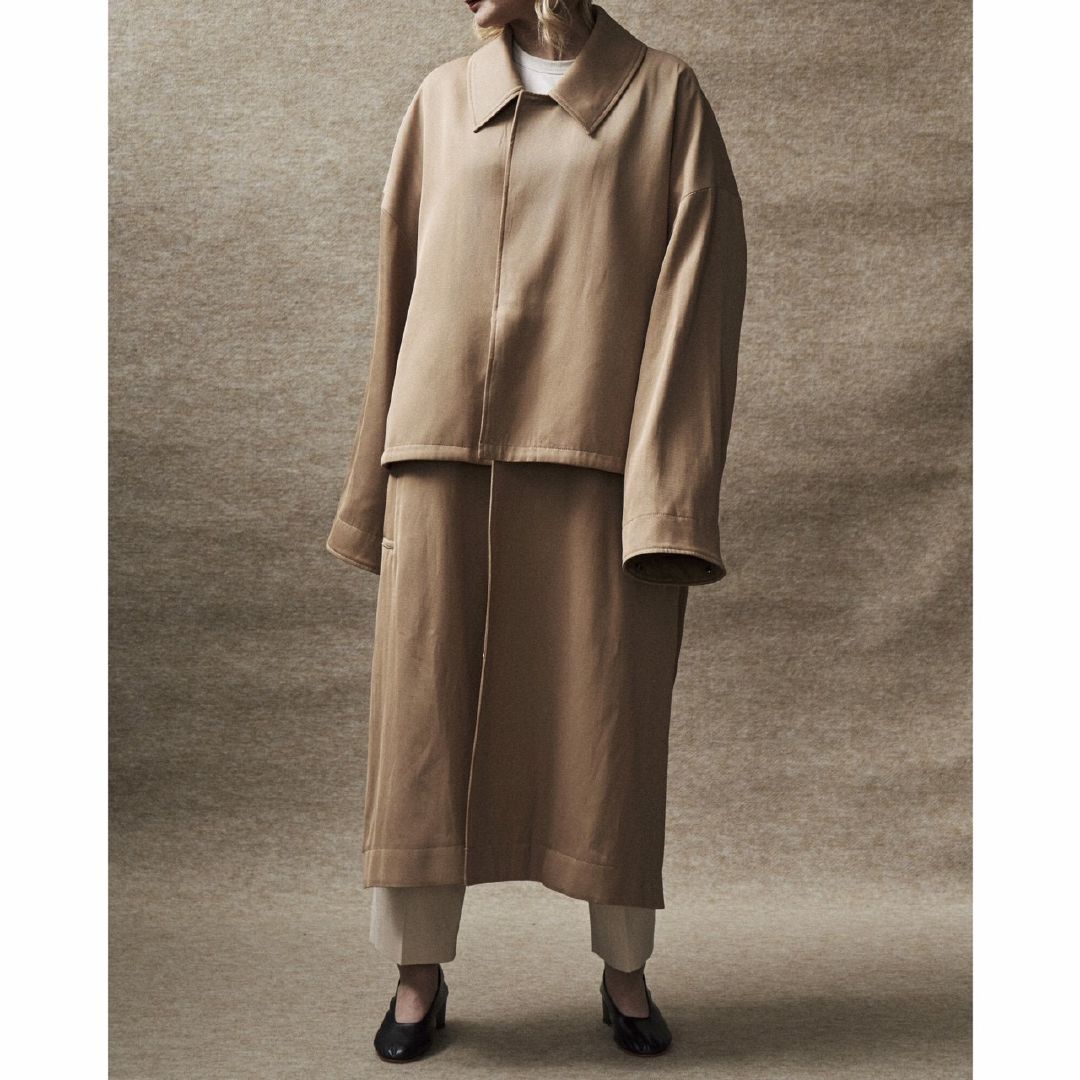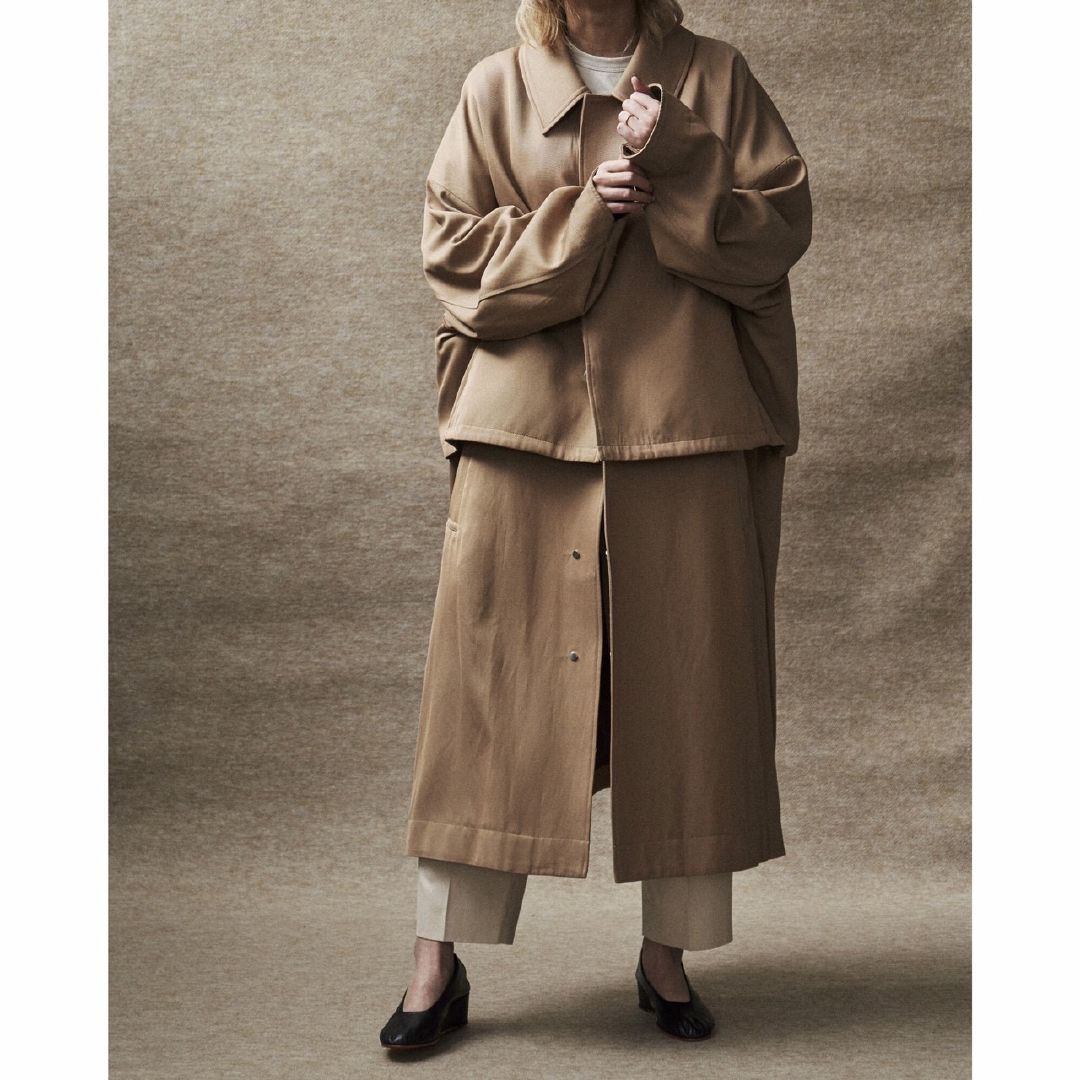 また肩が⼤きく落ちるドロップショルダーと太い袖、サイドに深く⼊ったスリットが独特なシルエットを構築。
