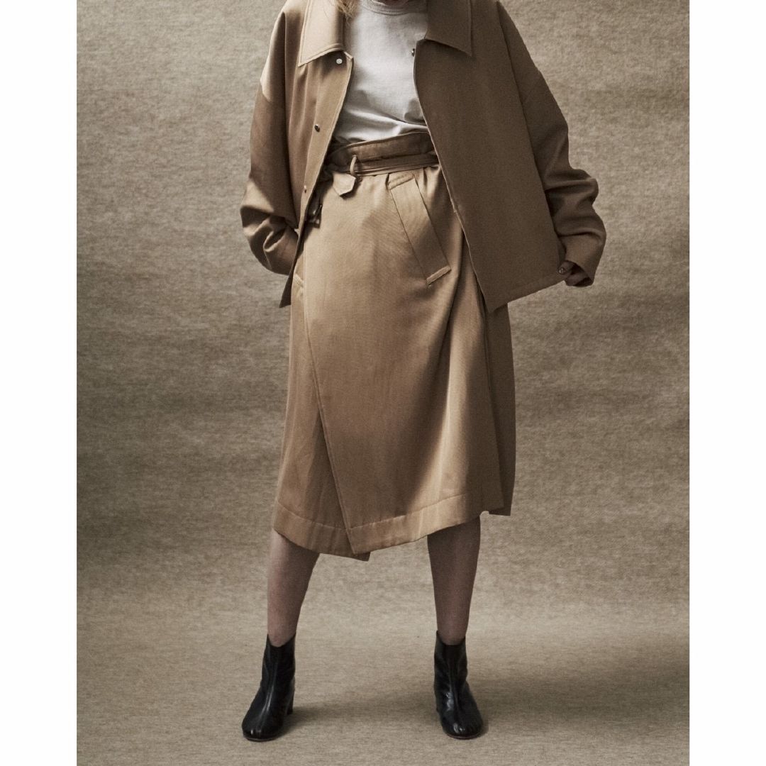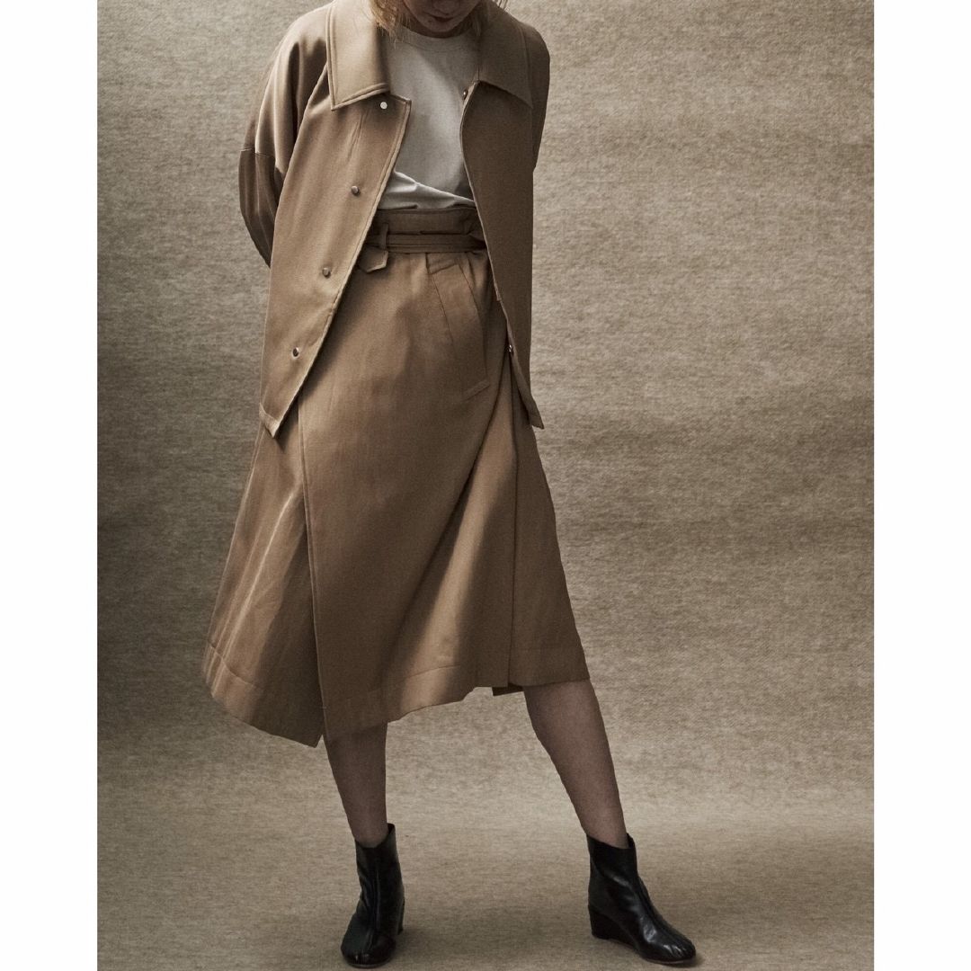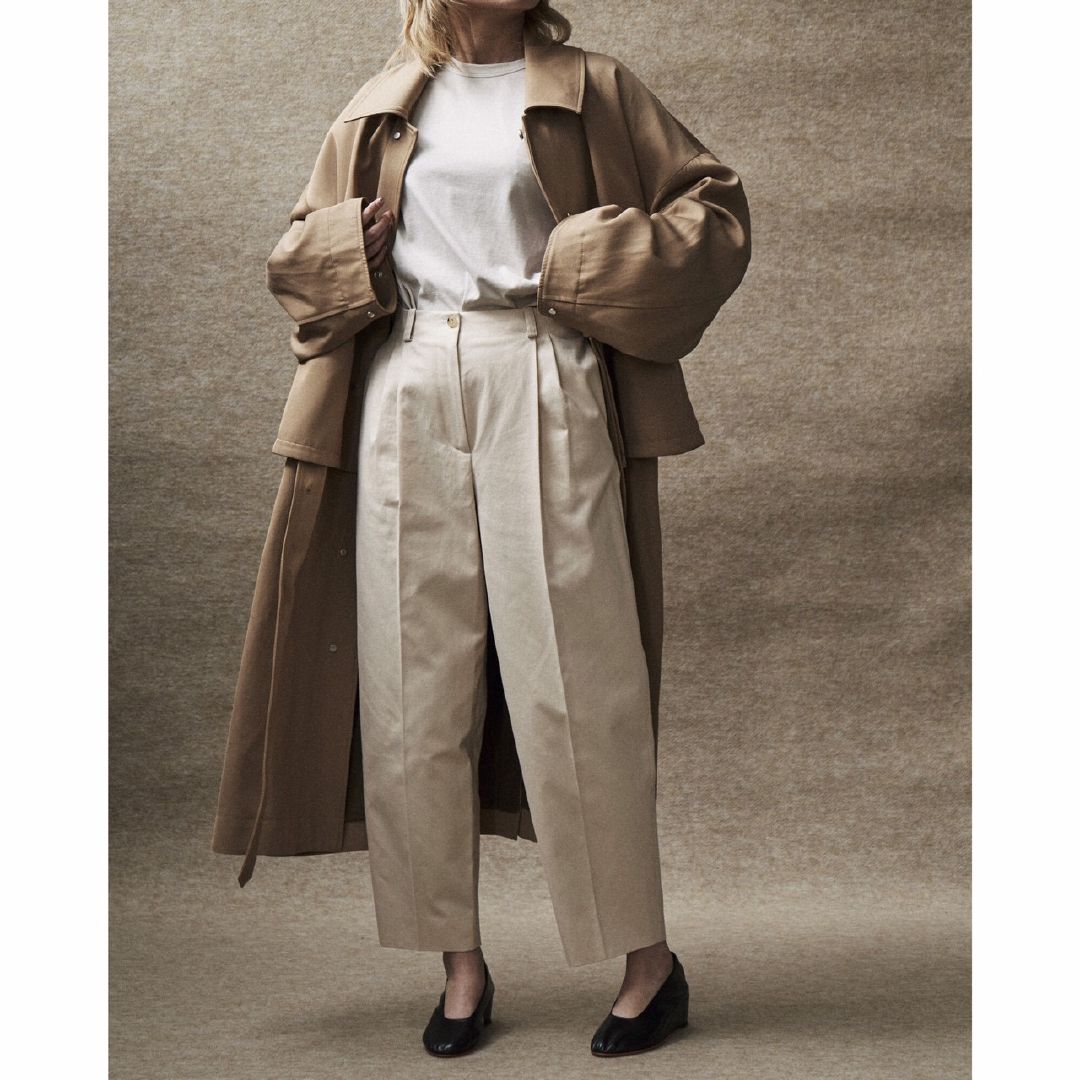 また肩が⼤きく落ちるドロップショルダーと太い袖、サイドに深く⼊ったスリットが独特なシルエットを構築。