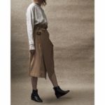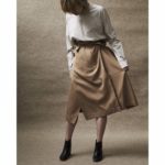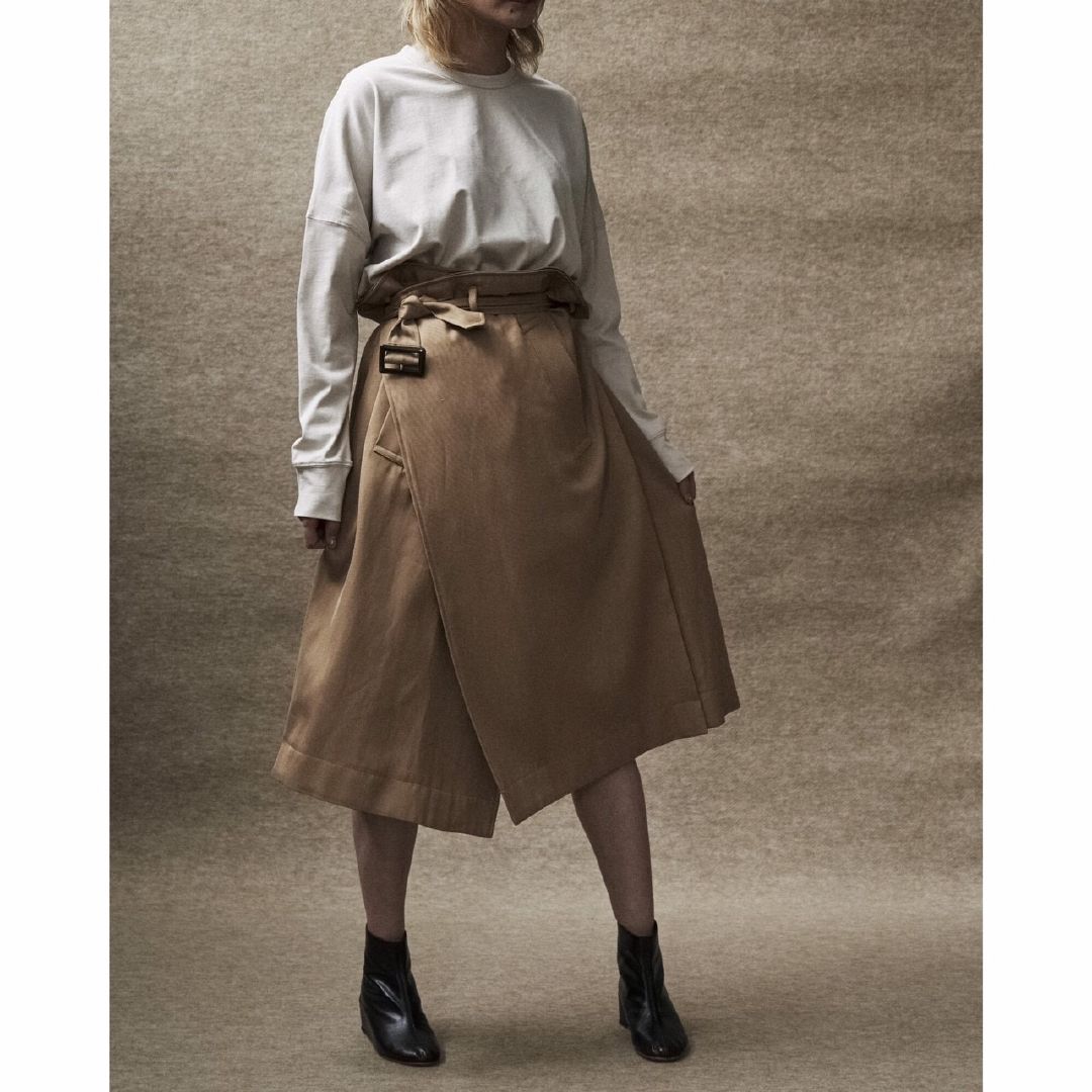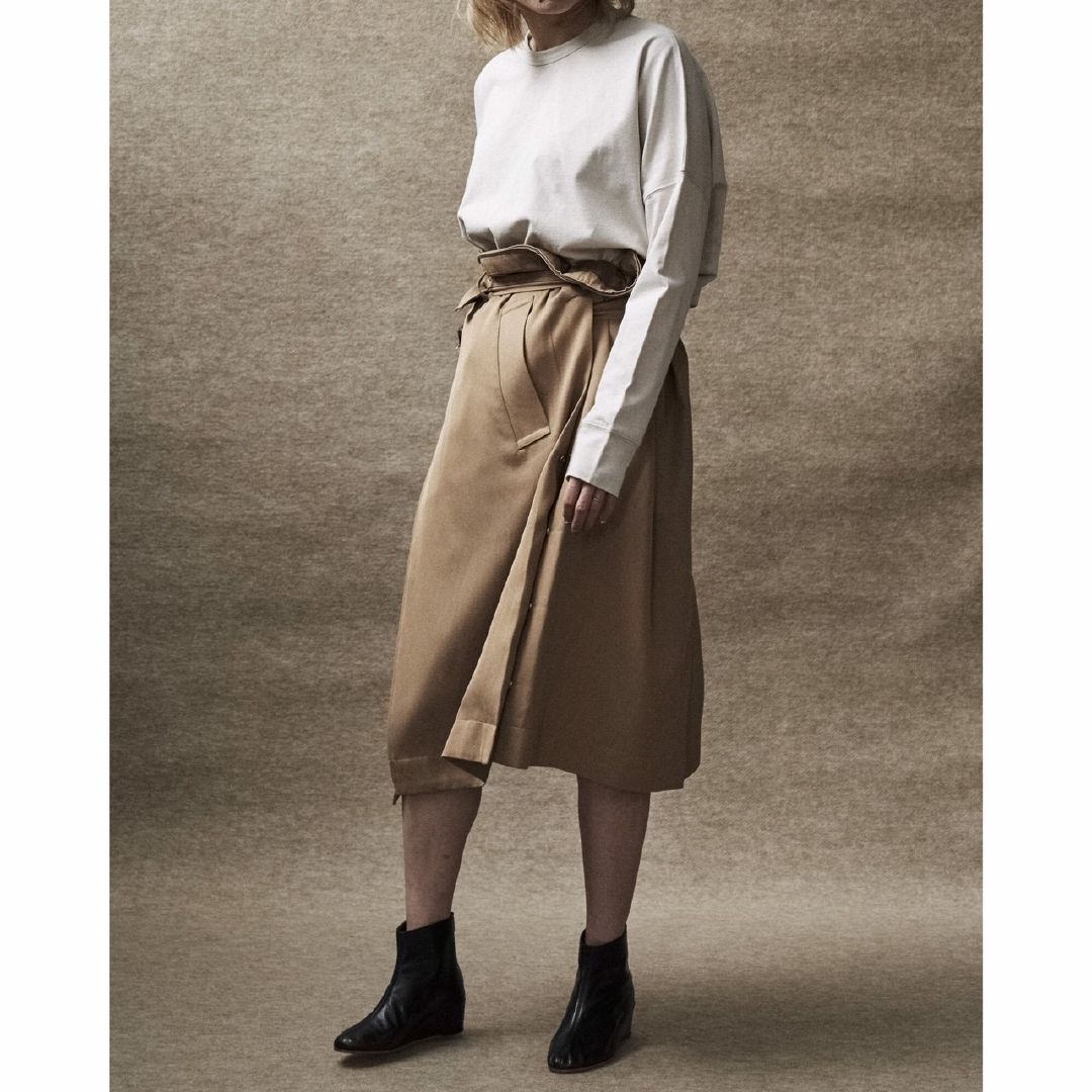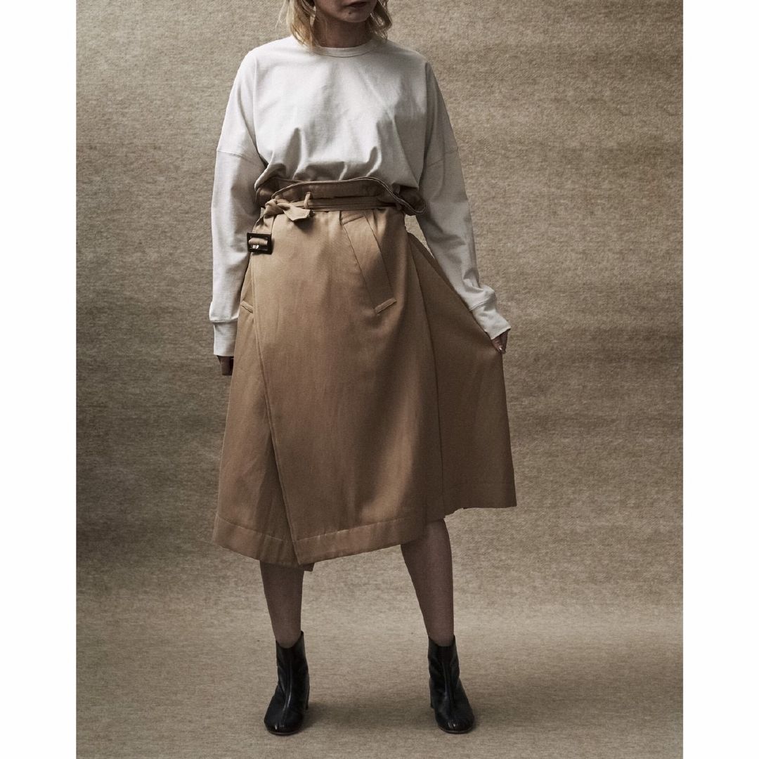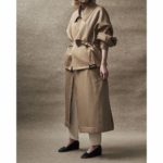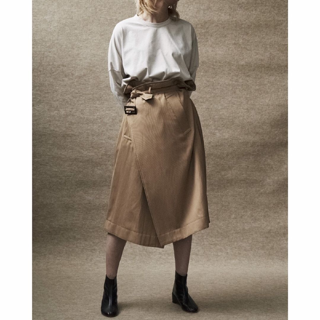 また肩が⼤きく落ちるドロップショルダーと太い袖、サイドに深く⼊ったスリットが独特なシルエットを構築。