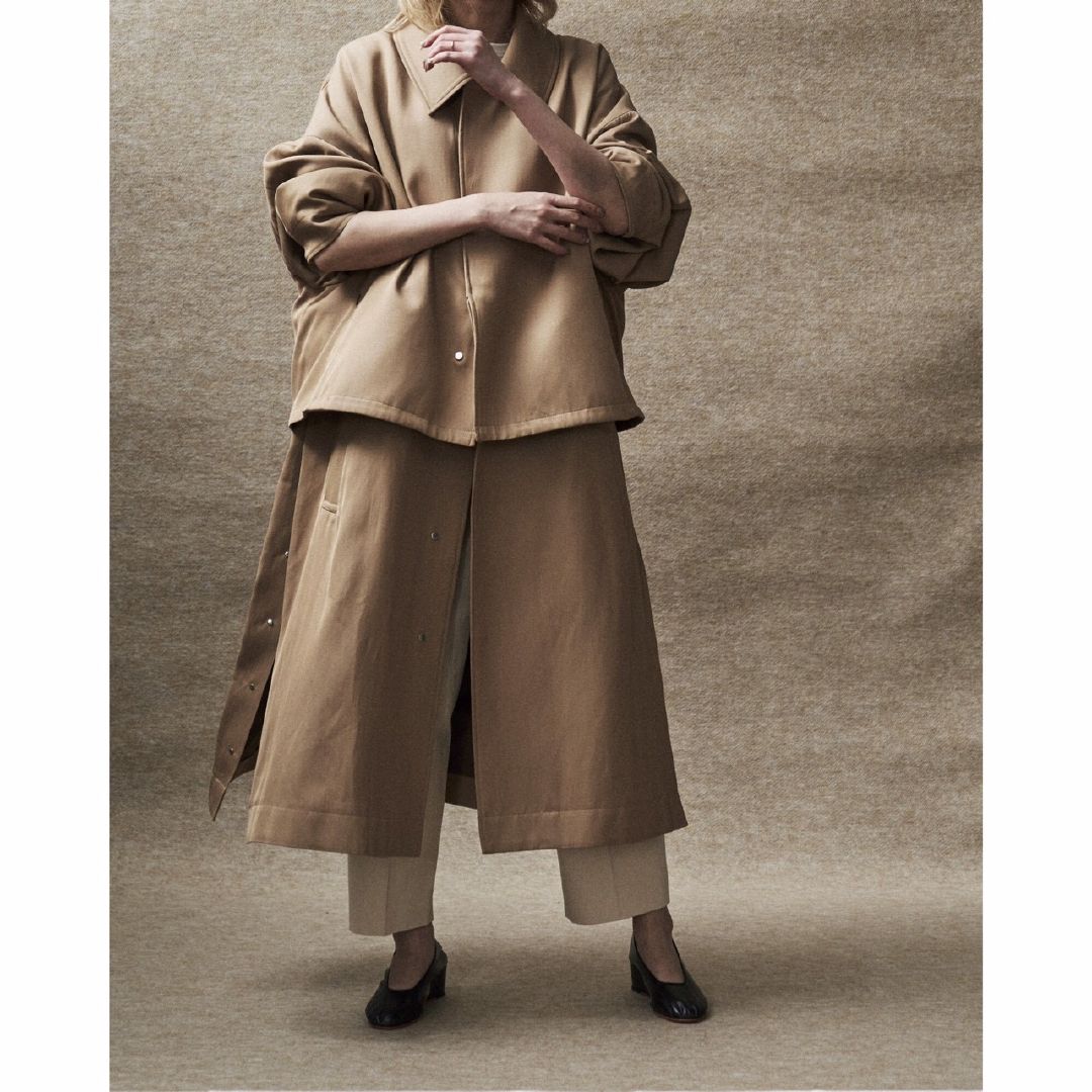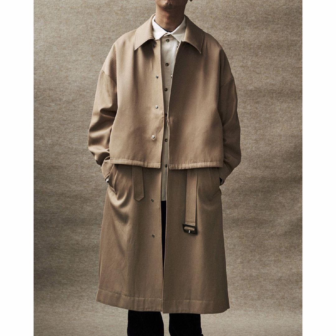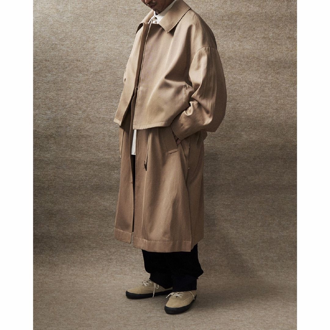 YOKEのシグネイチャーである3WAY BAL COLLAR SHARE COATをベースに、インラインのパンツで登場した強撚コットンキュプラツイルで別注。経⽷にキュプラ、横⽷にコットンを⽤いた強撚⽷にする事で、サラッとした肌触りとハリのある独特な素材感が肌抜けの良いこれからのシーズンにぴったりなコート。