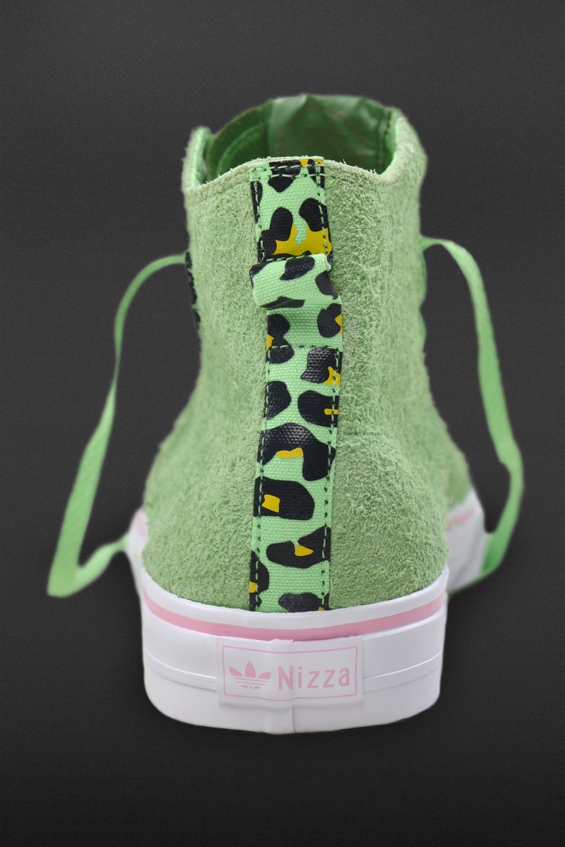 「Nizza RFS Hi x Na-Kel」は、スプリンググリーンのアッパーとアウトソールのピンクのカラーコントラストがディテールを際立たせています。バルカナイズ加工とクラシックなコートシューズの流線形のパディングは最大限の可動性を、二重のスエードのトゥカップは耐久性を提供します。チーターのグラフィックがプリントされたヒールタブとライナーが特徴的。