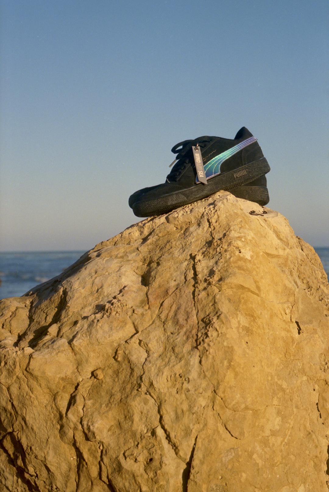 ベースとなったのは、プーマの人気モデル、RALPH SAMPSON (ラルフ サンプソン)。プーマを象徴するサイドのフォームストリップは、コレクションのテーマ “RETRO UTILITERIAN AND SPACE WORLD“ に合わせ、スエードやトランセントレジン(半透明樹脂)、エナメルレインボー、 宇宙服をイメージしたシルバーホログラムといった異素材のパーツに付け替えが可能。