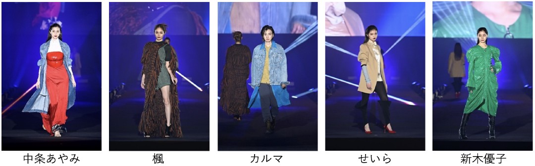今回のMCは、 出身地の久留米市から「くるめふるさと大使」にも任命されているお笑い芸人 こがけん と、 多くのメディアで幅広く活躍するフリーアナウンサー 柴田阿弥 のタッグでお届け!オープニングのトークステージでは、 着用したグローブが、 リサイクルペットボトルから作られたフェイクファーが採用されていることについて、 新木優子 「ペットボトル感は全然なくて、 ファーの素材も柔らかくてふわふわですし、 是非、 今年の冬に活用したいです!」と絶賛。 また、 環境に配慮した素材を使用するだけでなく、 服を加工する時に使用する水や化学薬品を大幅に削減した製法で作られたデニムコートを着用した 中条あやみ は「生地もすごいしっかりしていて、 高級感もあるので、 着ていて素敵なデザインだなと思いました。 」と語った。