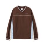 今回の別注作に付随し、「atmos pink」と「PUMA」のコラボレーションアパレルも作製。トレンドカラーのブラウンとデニムを意識したブルーカラーがポイントのベロア素材のジャージのセットアップとナンバリングのプルオーバーが完成。