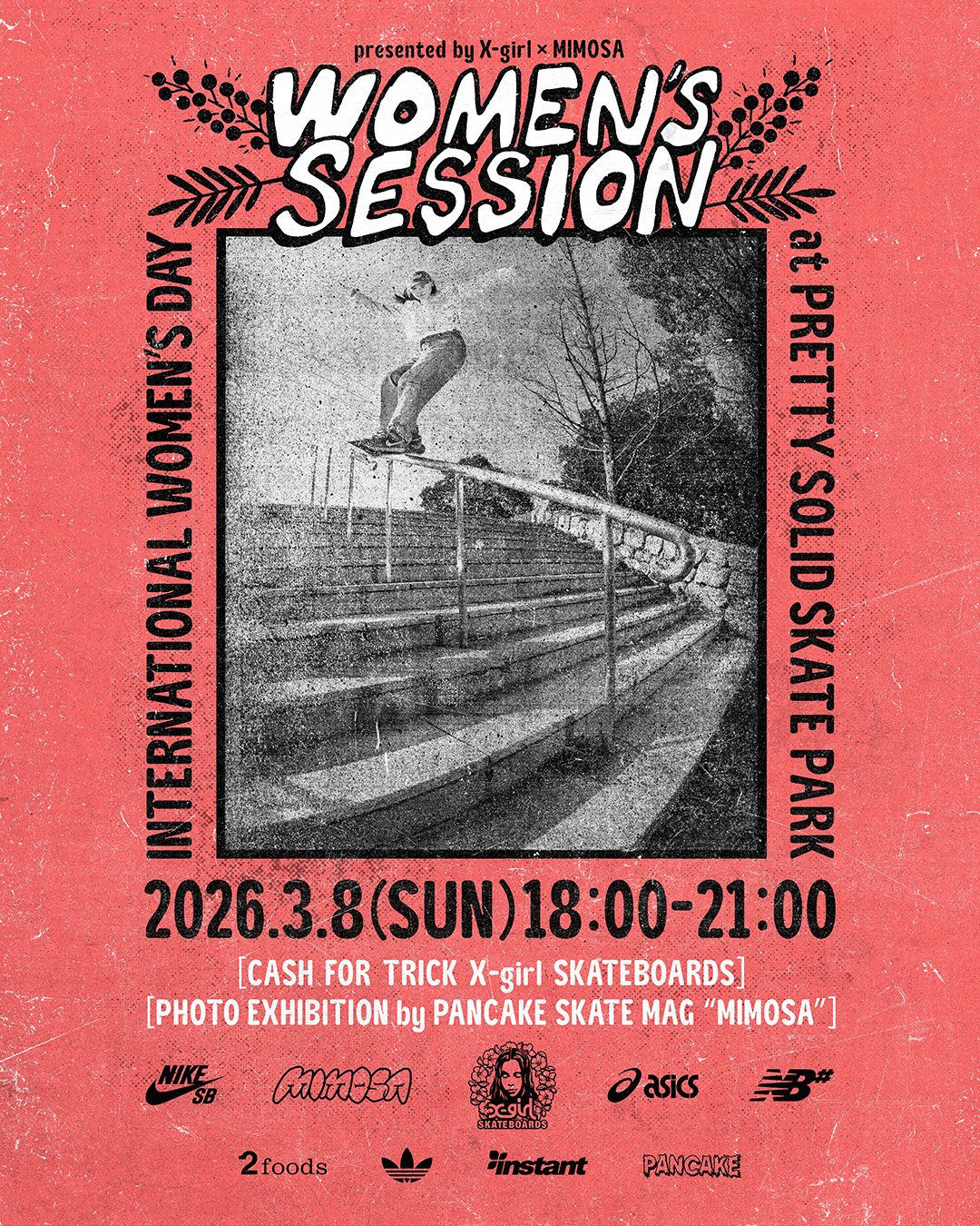 株式会社ビーズインターナショナル(本社:東京都目黒区、代表取締役社長:西方雄作)が展開するストリートブランド「X-girl(エックスガール)」のスケートボードに特化したコンテンツ「X-girl skateboards(エックスガールスケートボード)」は、フリーマガジン「PANCAKE SKATEBOARD MAGAZINE(パンケーキ スケートボード マガジン)」と共に、2026年3月8日(日)に、スケートボードイベント『WOMEN’S SESSION by X-girl × MIMOSA』を開催することを発表した。