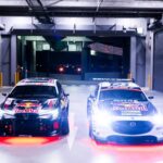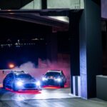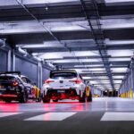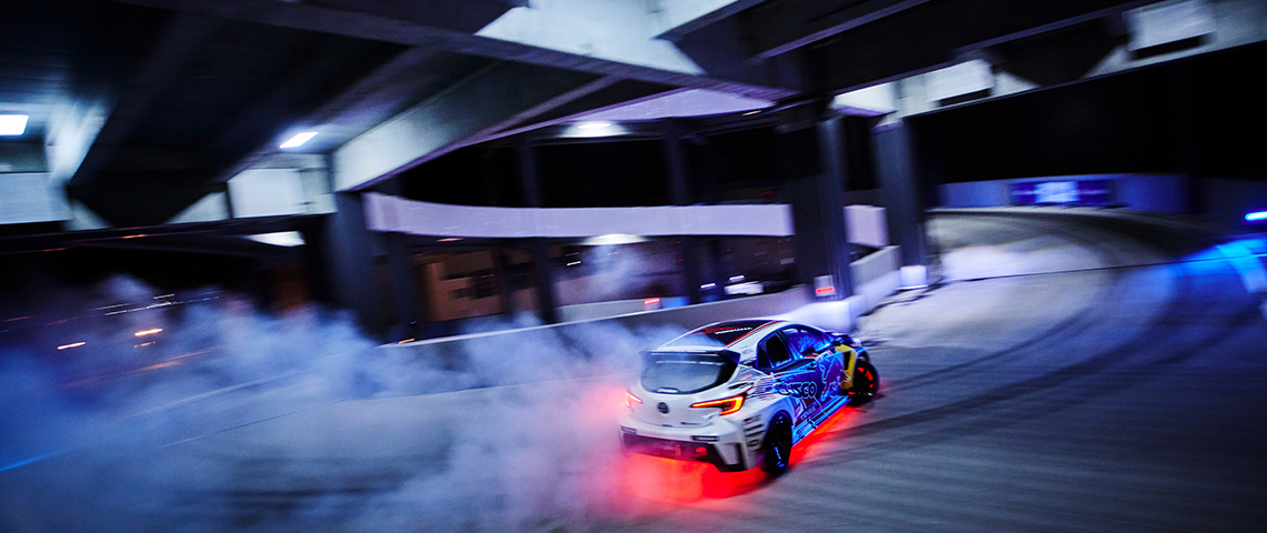 倉庫のランプウェイを何度も上下に縦⾛する Toyota GR Corolla と MAZDA 3